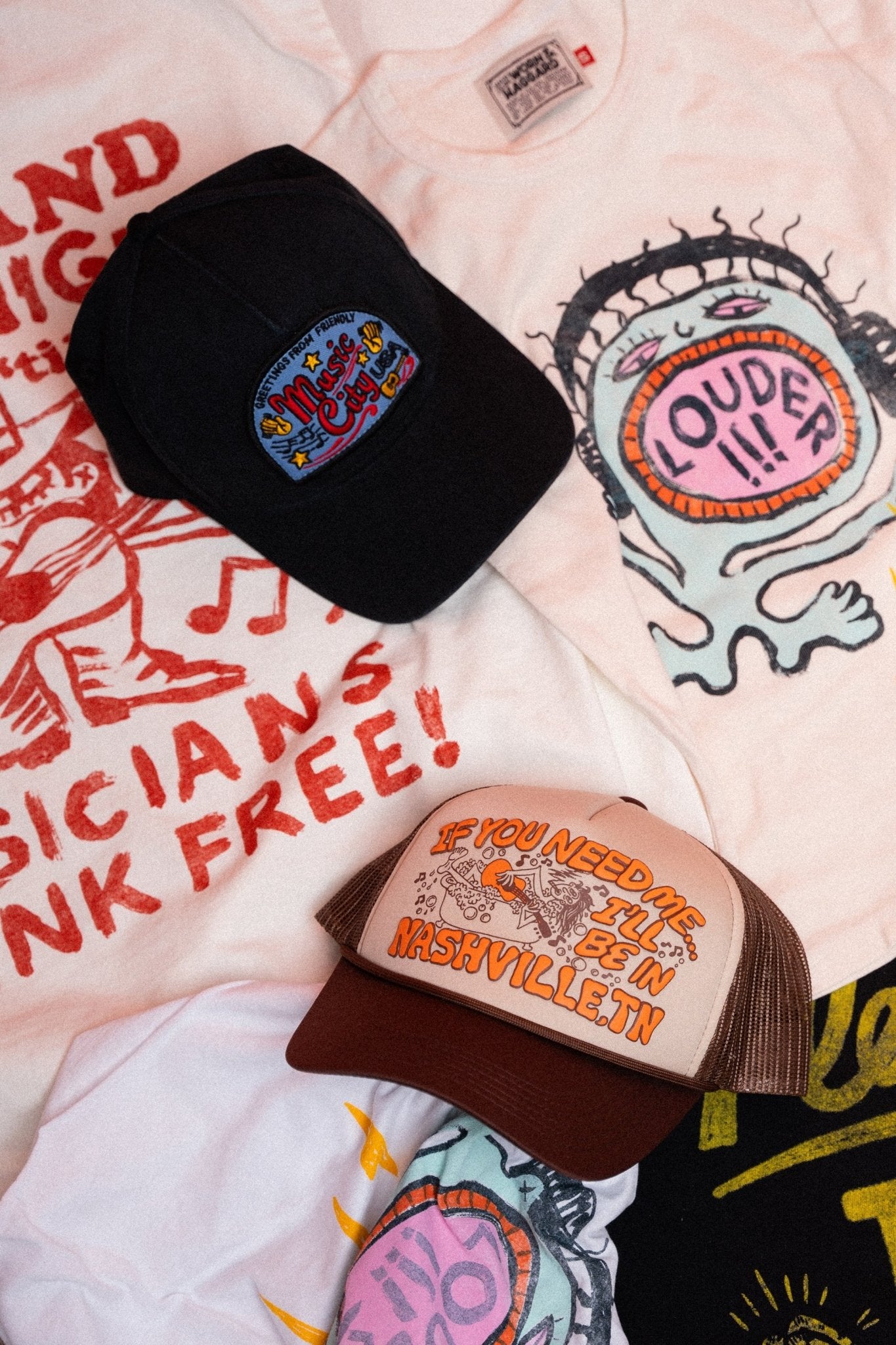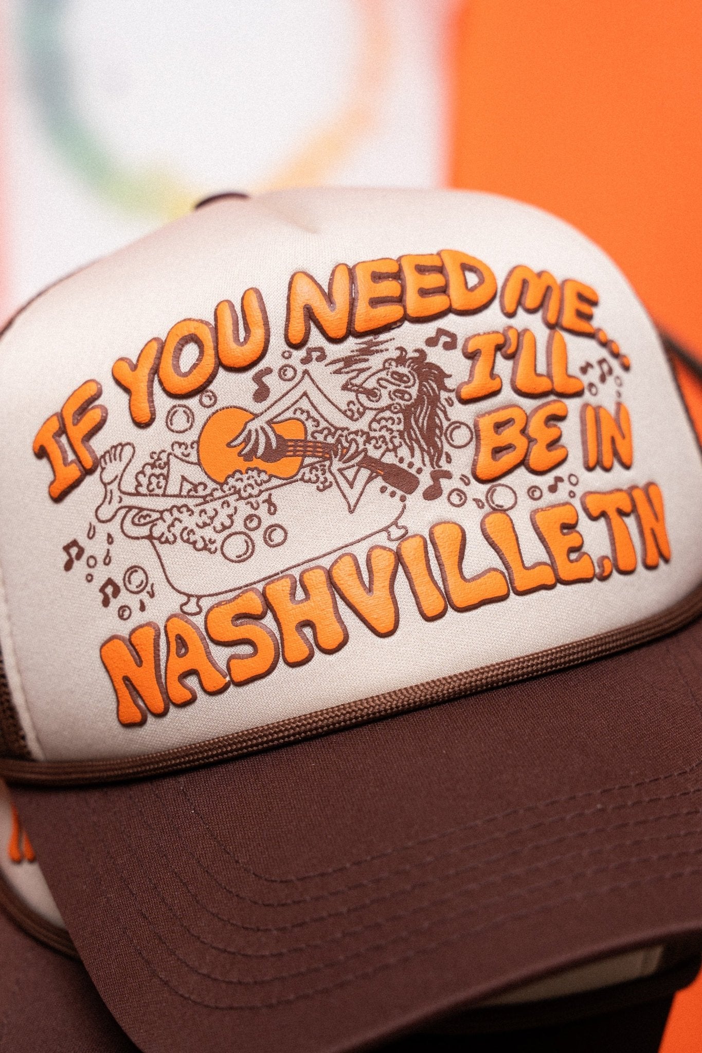 Created as a tribute to the musicians who jam (even in the bathtub). Screen-printed on a vintage-inspired foam trucker hat with a combination of standard and puff ink. High profile, breathable mesh, and plastic snap closure. Features hand-drawn artwork designed by Hailey in Nashville.
