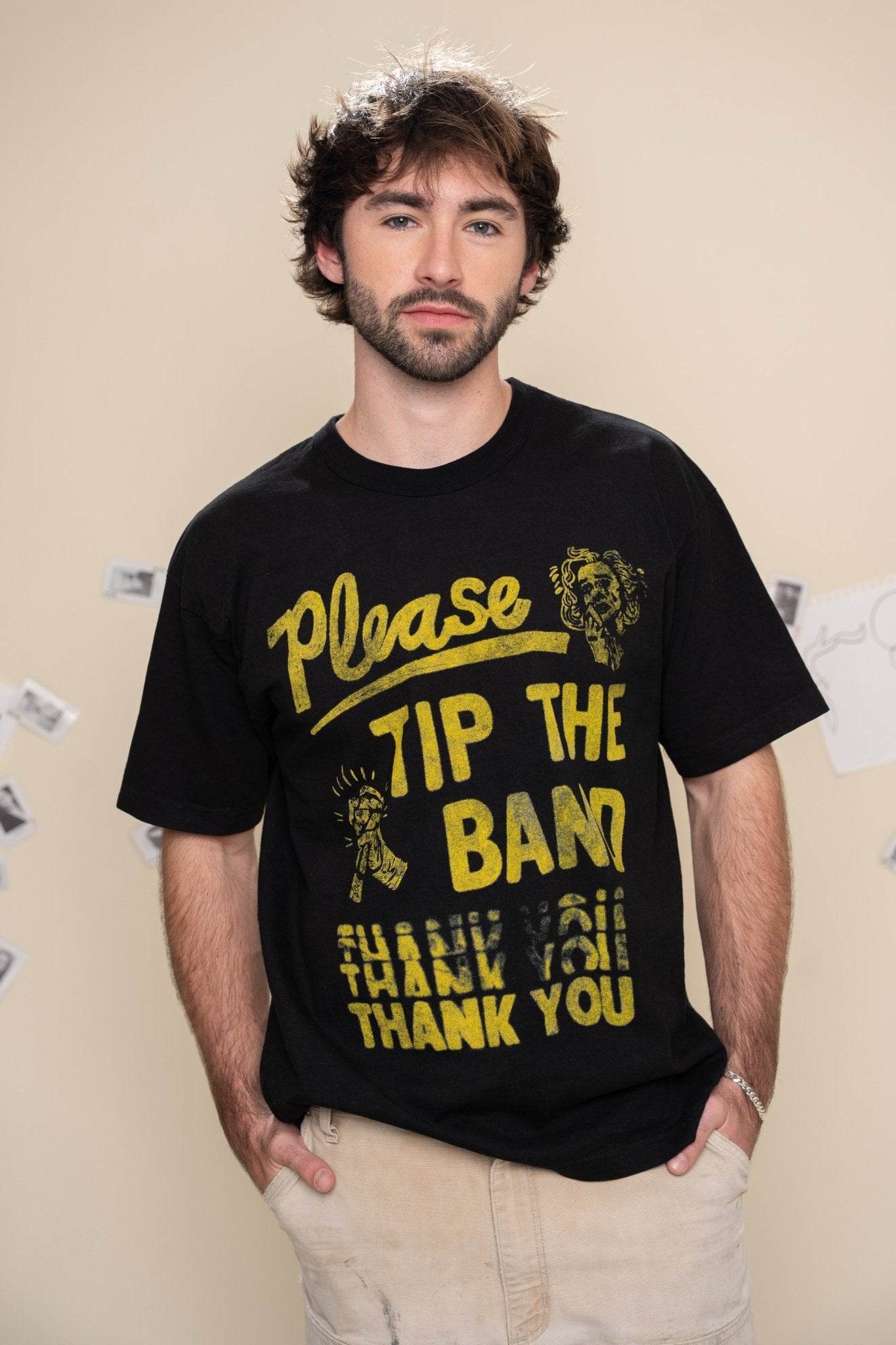 Created in honor of the musicians who deserve a bigger tip. Printed on a structured 8.5 oz cotton tee with a slightly boxy, unisex fit and substantial feel. Designed from hand-drawn artwork created by Hailey. Screen-printed in Nashville on garments made in Los Angeles.